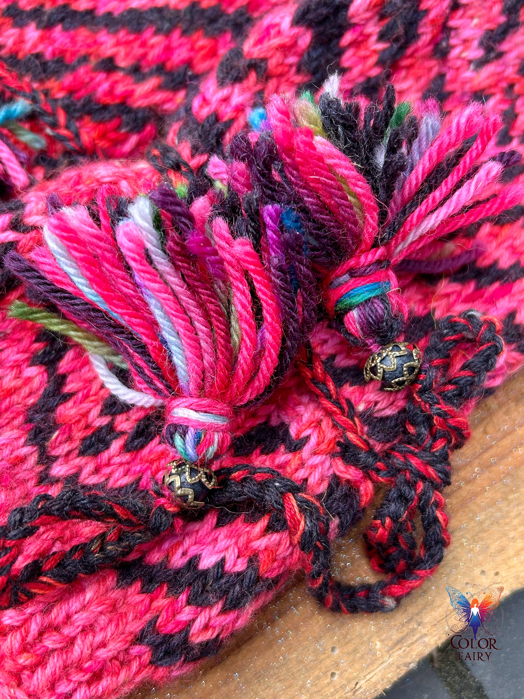 Ein Auffälliges Highlight sind die kleinem Bommel die lang hängen, oder mit einer Schleife um das Handgelenk gekürzt werden können.